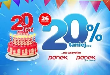 Z okazji 20-lecia istnienia PANEK S.A w dniu jubileuszu, 26 września firma obniży ceny swojej flagowej usługi - PANEK CarSharing. Jest to największa promocja w historii marki. Wszystko będzie tańsze o 20%. Poza ceną za minutę i kilometr promocja dotyczyć będzie też pakietów dobowych, tygodniowych i miesięcznych. Obniżka obejmie również „rozszerzoną ochronę”, która zabezpiecza przed szkodami oraz przedpłaty.